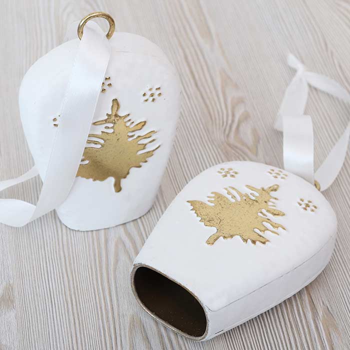 Hanging bell decoration/bell with engraved decoration, made of metal, white and gold finish.