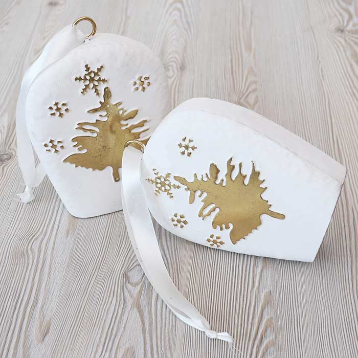 Hanging bell decoration/bell with engraved decoration, made of metal, white and gold finish.