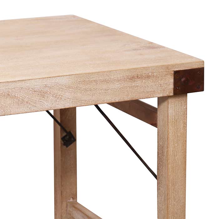 Mango wood table, white sandblasted finish, with antique-finish metal elements.