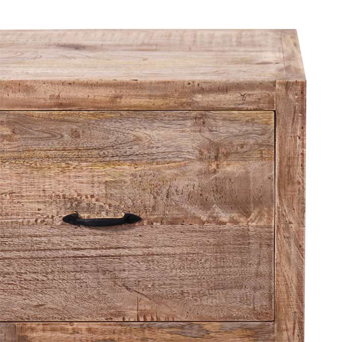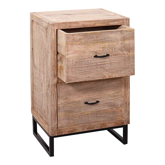 Chest of drawers made of wood, natural finish, equipped with two drawers and a metal frame with a matte black finish.
