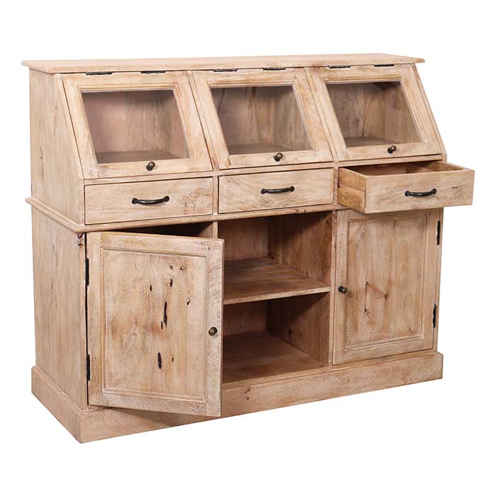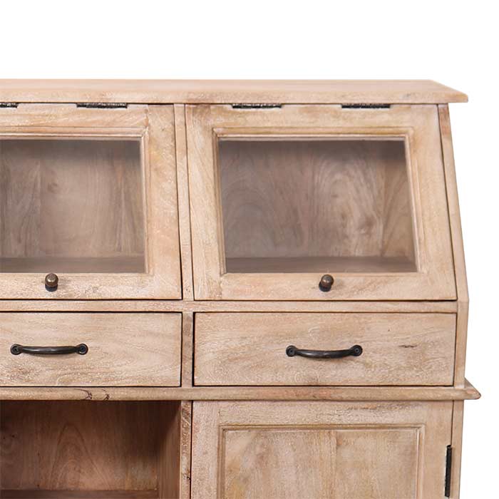 Cabinet made wood with a white sandblasted finish, consisting of two doors, two open shelves, three drawers and three drop-down doors.