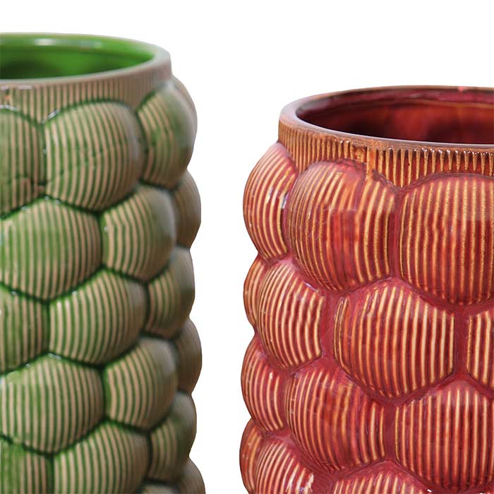 Set of two ceramic vases, green and red finish.