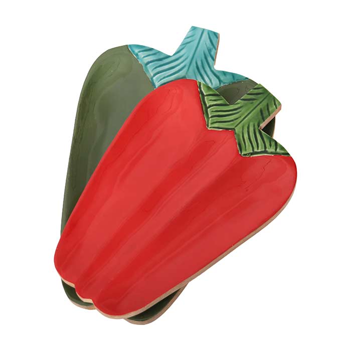 Set of two pepper-shaped plates, made of mango wood, with a glossy lacquered decoration.