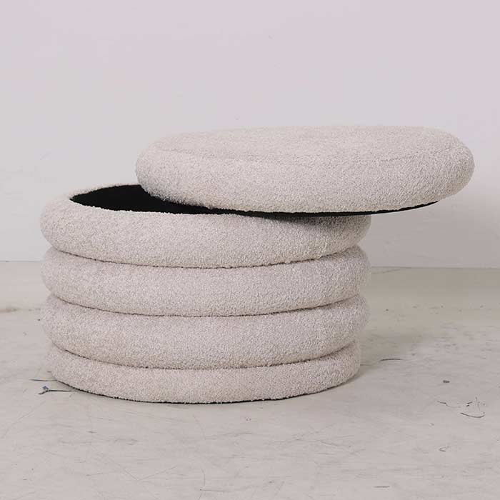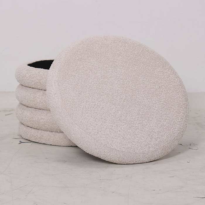 Storage pouf made with natural boucle fabric.