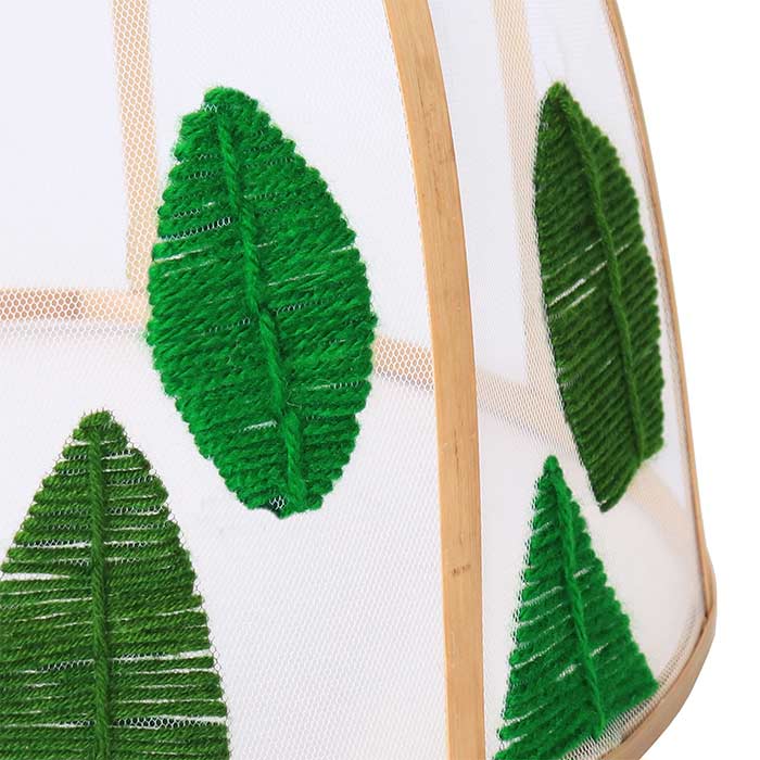 Round food cover, made of bamboo, with embroidered decoration in the shape of green leaves.