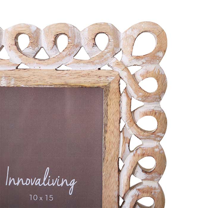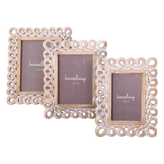 Set of 3 MDF photo frames with a contoured frame and whitewash finish. Suitable for 10x15, 13x18, and 15x20 photos.
