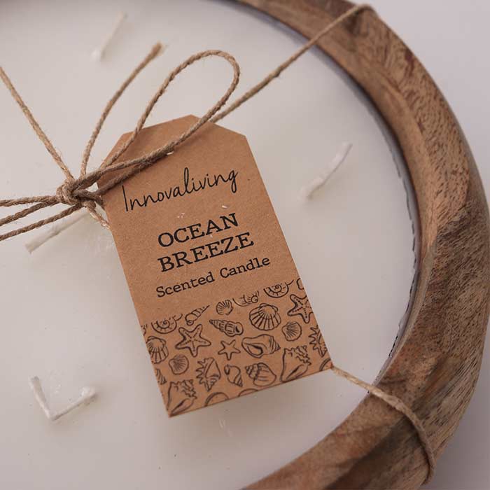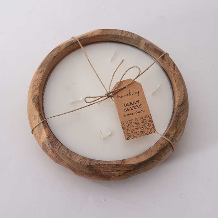 Round container made of wood, natural finish, with ocean breeze scented candle, 5 wicks.