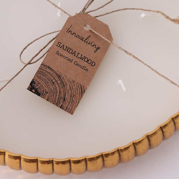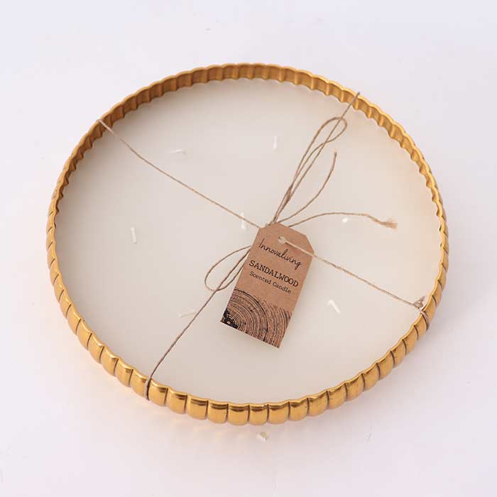 Aluminum container, gold finish, with sandalwood scented candle, 9 wicks.