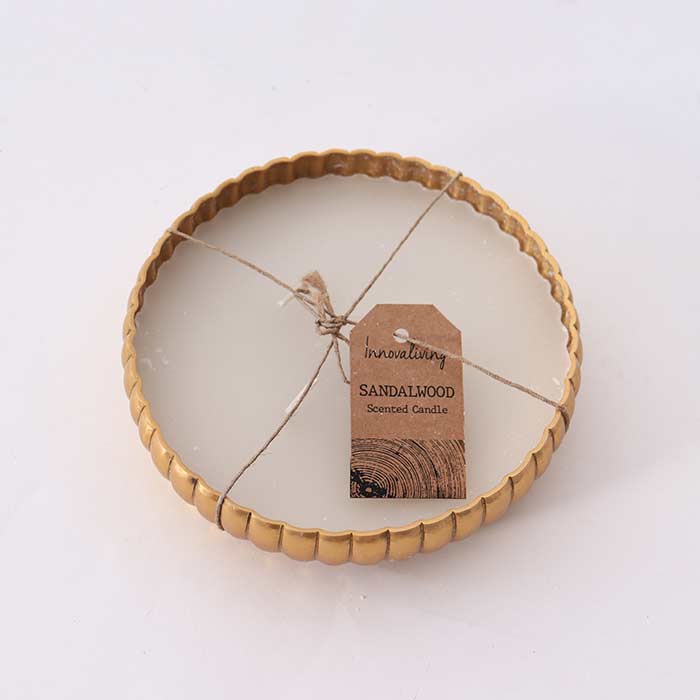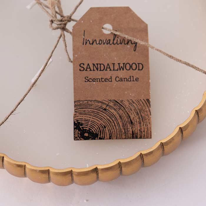 Aluminum container, gold finish, with sandalwood scented candle, 5 wicks.