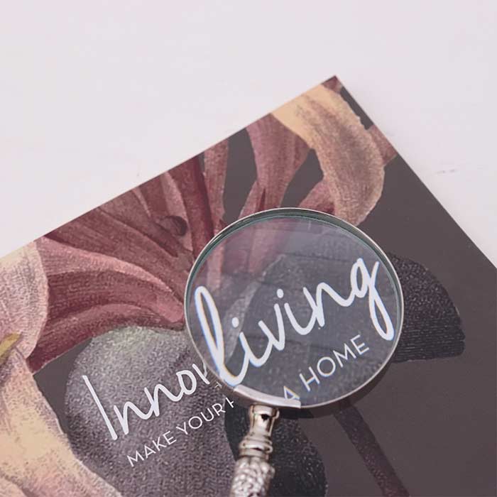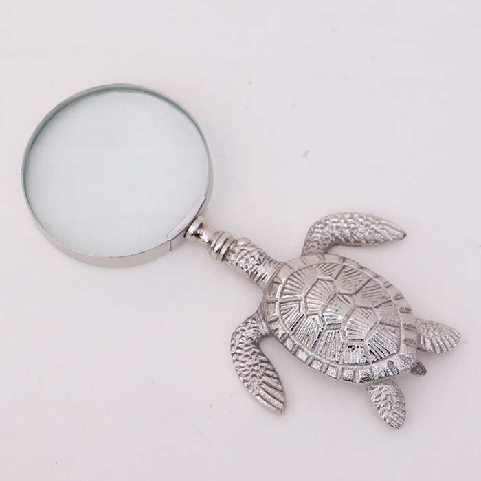 Magnifying glass, with turtle-shaped handle, made of silver-finished aluminum.