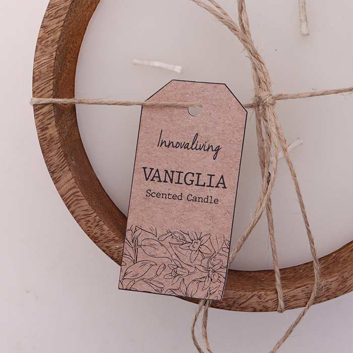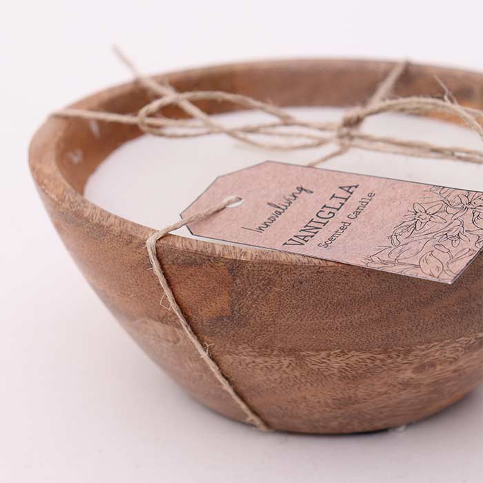 Round container made of wood, natural finish, with vanilla scented candle, 5 wicks.