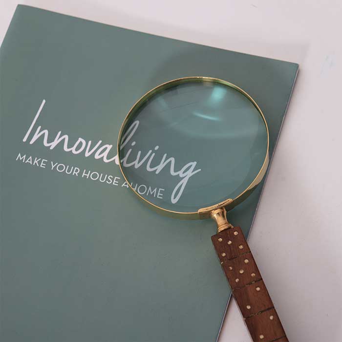 Magnifying glass, with natural finish wooden handle, shaped like a dice.