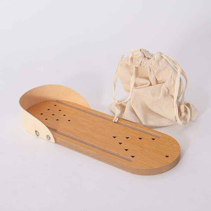 Bowling game made of MDF and plastic bumpers, equipped with wooden bottles, white finish.