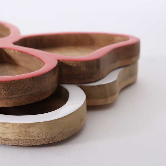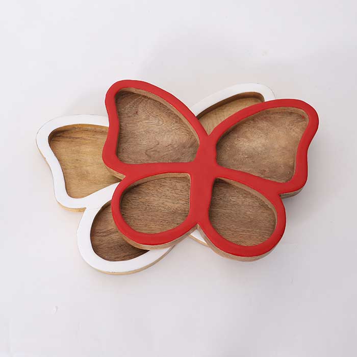 Set of two butterfly-shaped containers made of mango wood, natural finish, with enamel decoration in two colors: white and red.