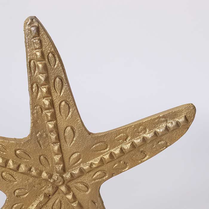 Set of two starfish-shaped decorations, made of gold-finish aluminum, with a natural mango wood base.