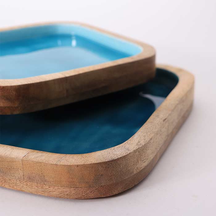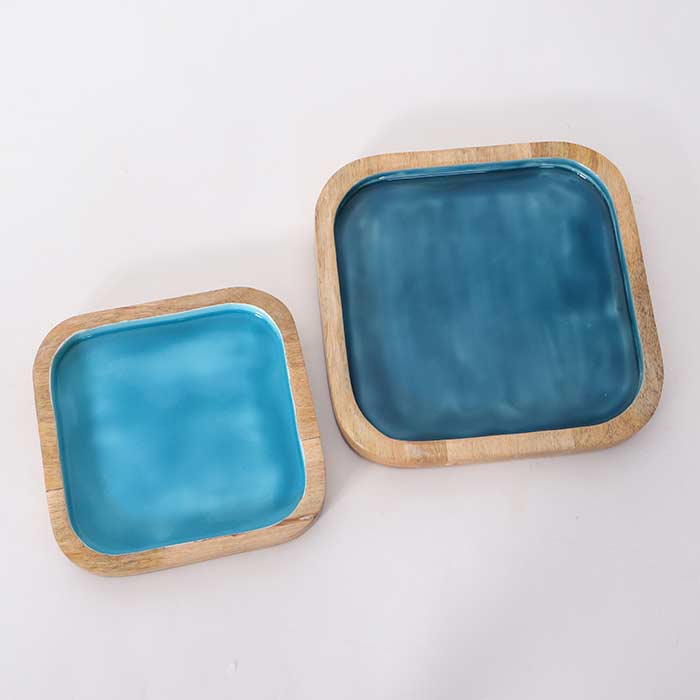 Set of two square plates made of mango wood, natural finish, with enamel decoration in two shades of blue.