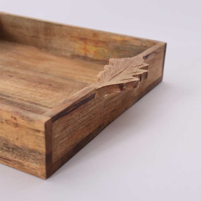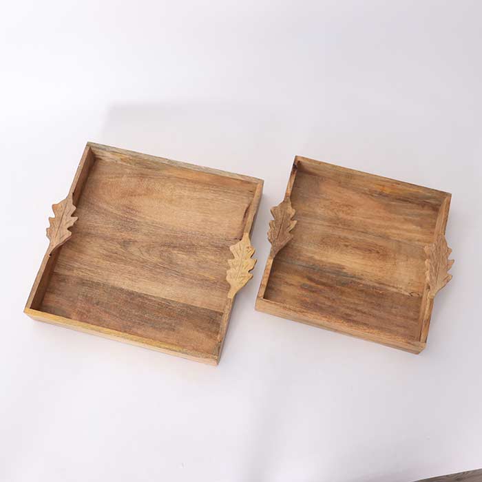 Set of two square trays, made of mango wood with a natural finish, with decorative leaf-shaped handles.
