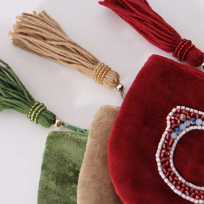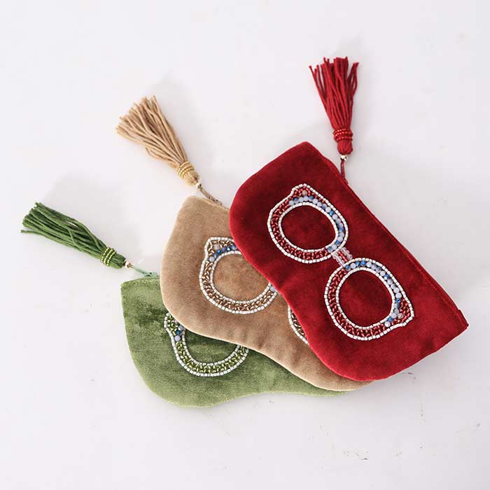 Velvet fabric eyeglass case, internally lined and with beaded decoration on the front, available in three colors: natural, green and red.