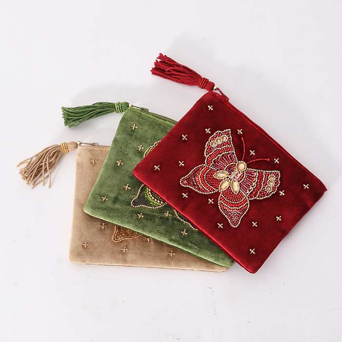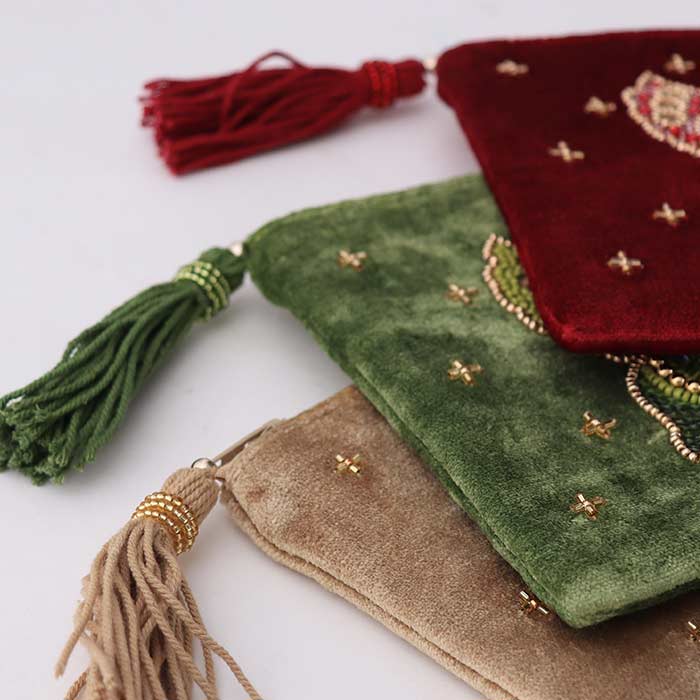 Velvet fabric clutch bag, internally lined and with beaded decoration on the front, available in three colors: natural, green and red.
