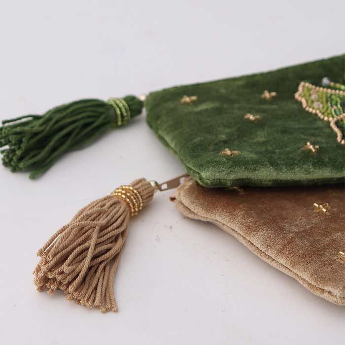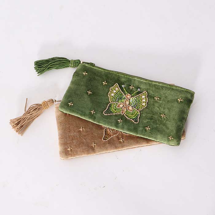 Velvet fabric clutch bag, internally lined and with beaded decoration on the front, available in two colors: natural and green.