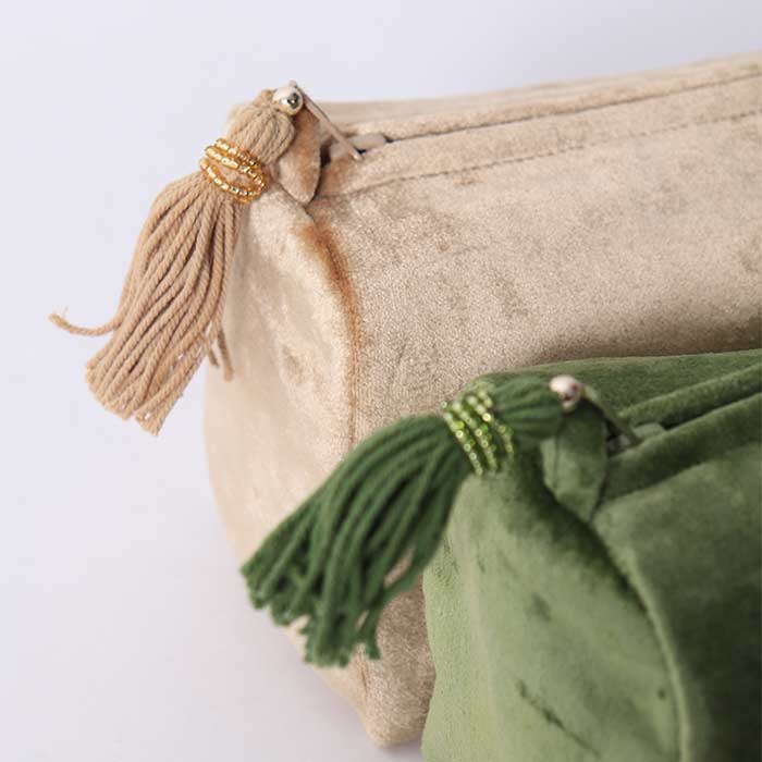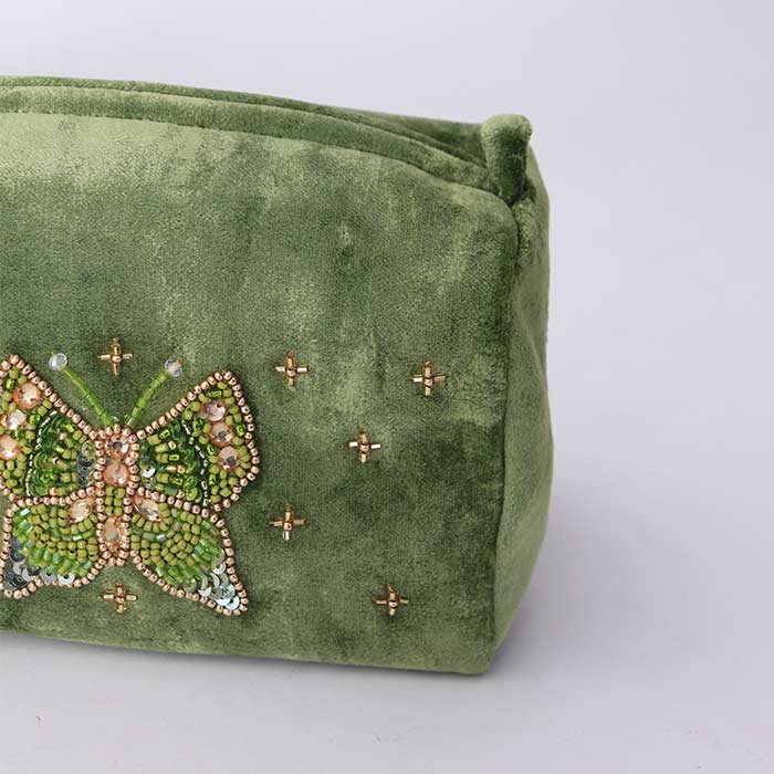 Vanity clutch in velvet fabric, internally lined and with beaded decoration on the front, available in two colors: natural and green.