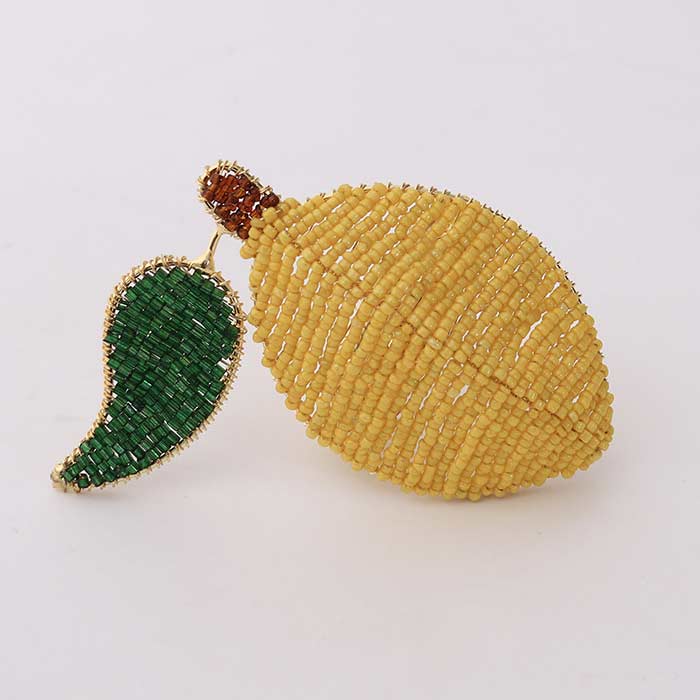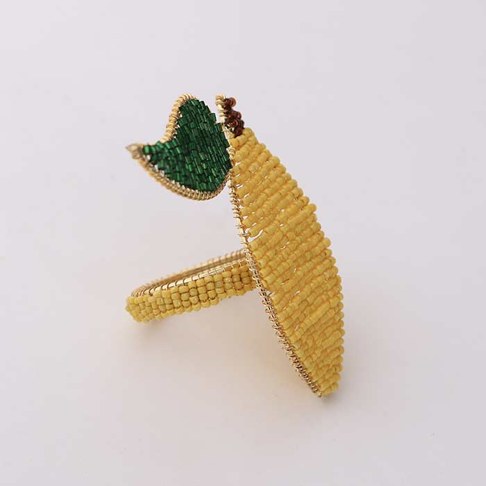 Set of six lemon-shaped napkin rings, made of colored beads and a metal frame.
