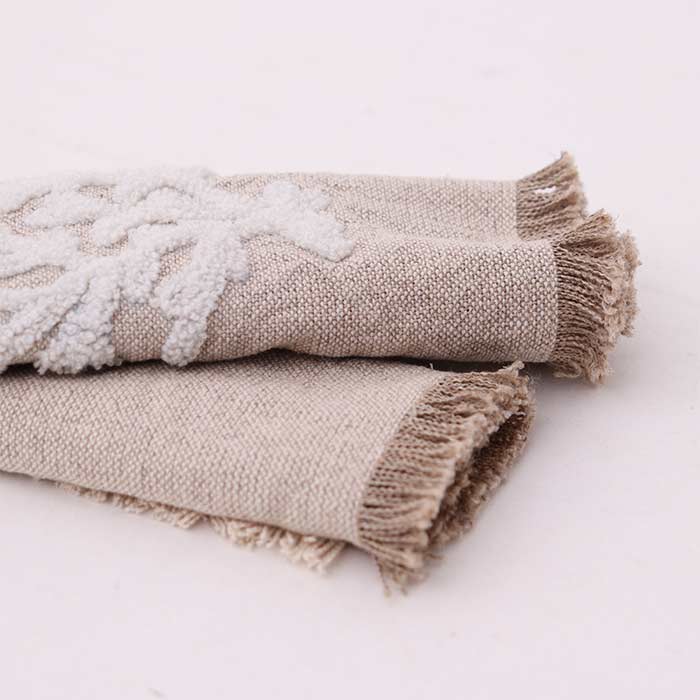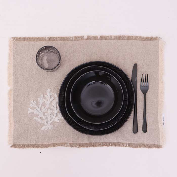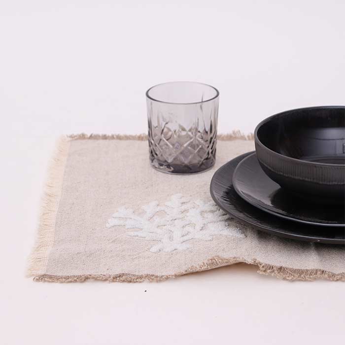Tovaglietta rettangolare realizzata in misto 50% cotone e 50% lino, color naturale, con corallo bianco ricamato.