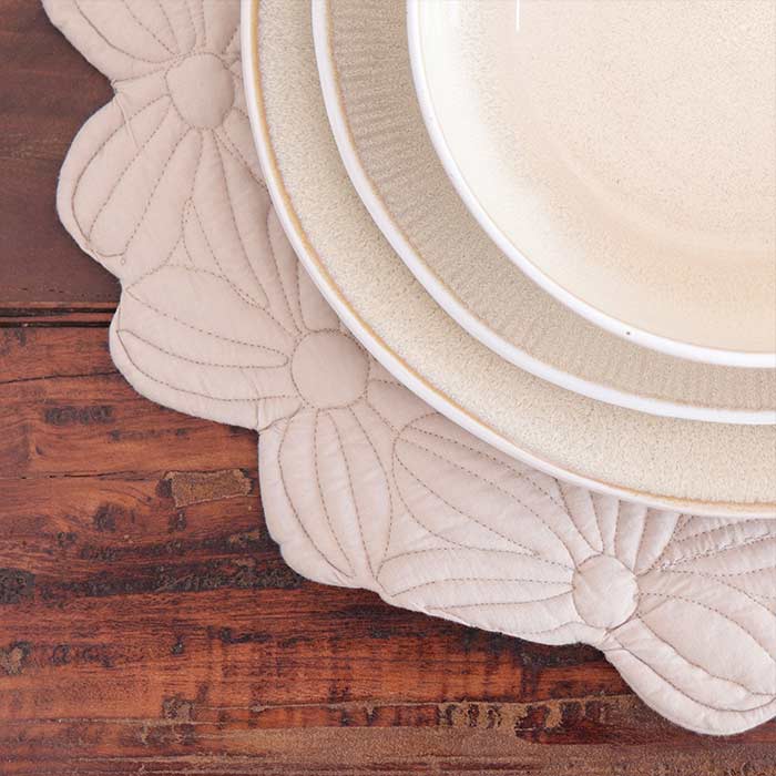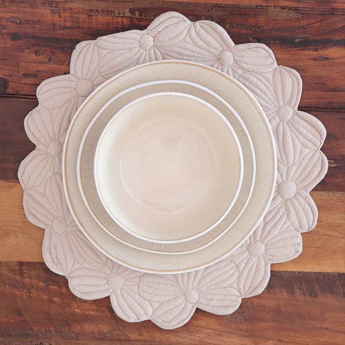 Sottopiatto tondo realizzato in cotone, colore naturale, leggermente imbottito.