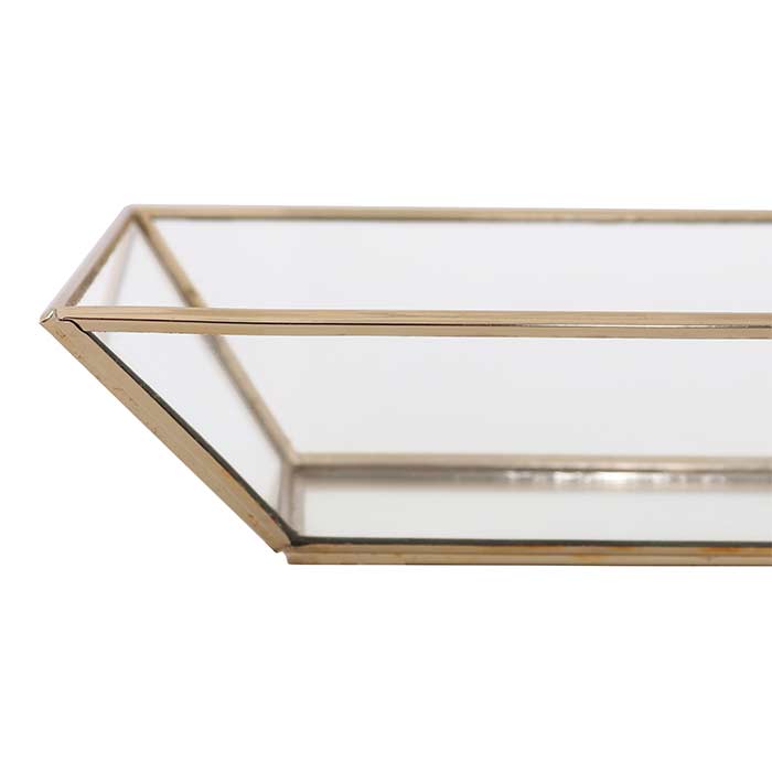 Set due vassoi rettangolari realizzati in metallo, finitura champagne lucida, e vetro trasparente.