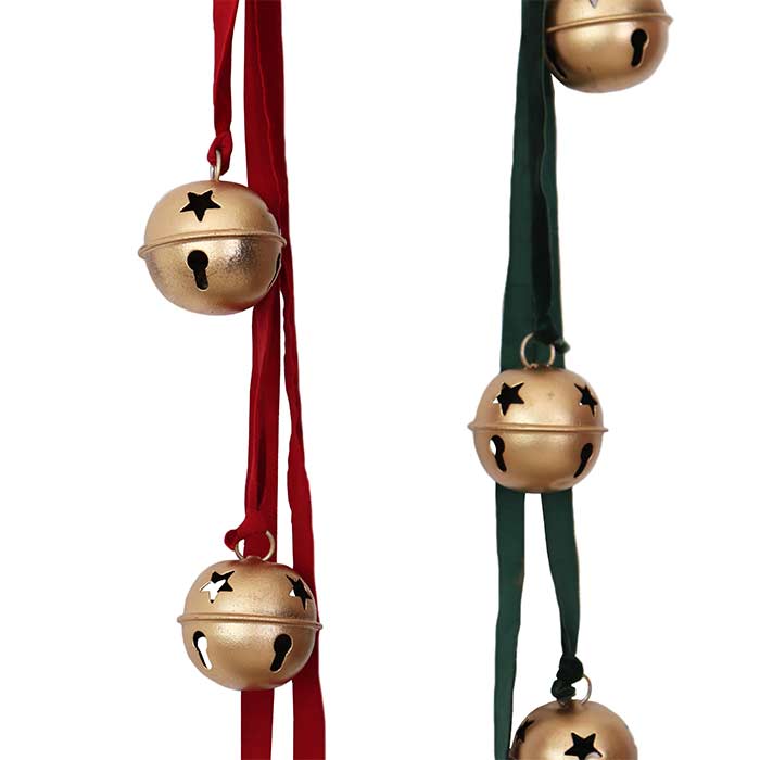 Ghirlanda con campanelle, in metallo finitura antik gold, e nastrino in velluto in due colori assortiti: rosso e verde.