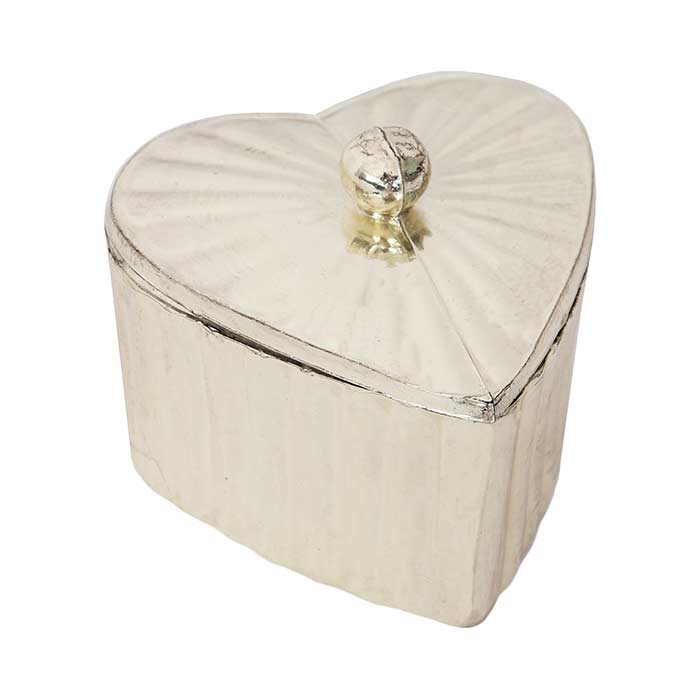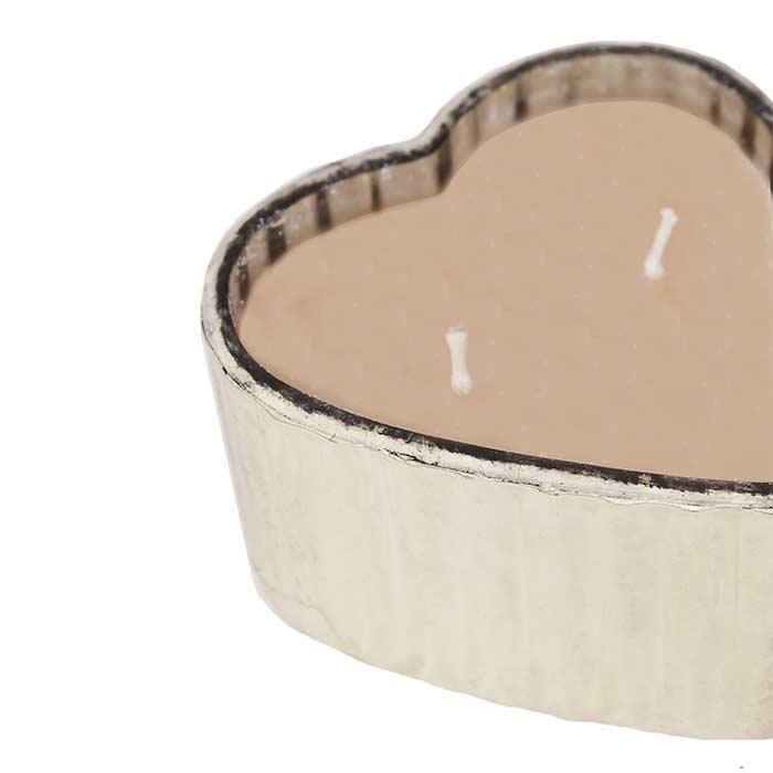 Scatola a forma di cuore con coperchio in vetro, finitura argento anticato, con cera profumazione vaniglia.