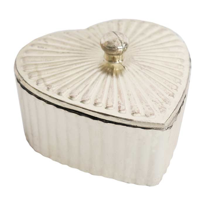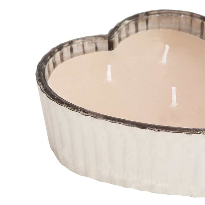 Scatola a forma di cuore con coperchio in vetro, finitura argento anticato, con cera profumazione vaniglia.