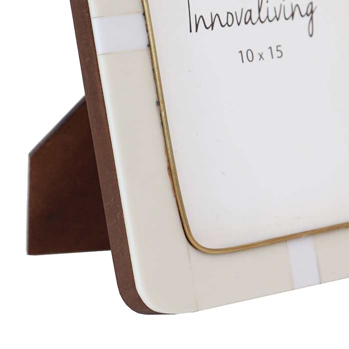 Portafoto con struttura in MDF e cornice rivestita in resina finitura naturale con dettaglio in ottone. Per foto 10x15