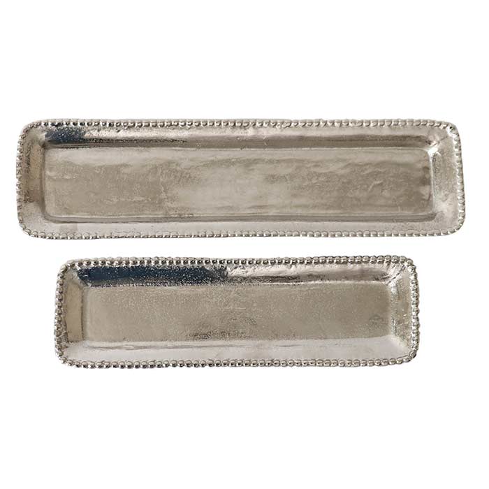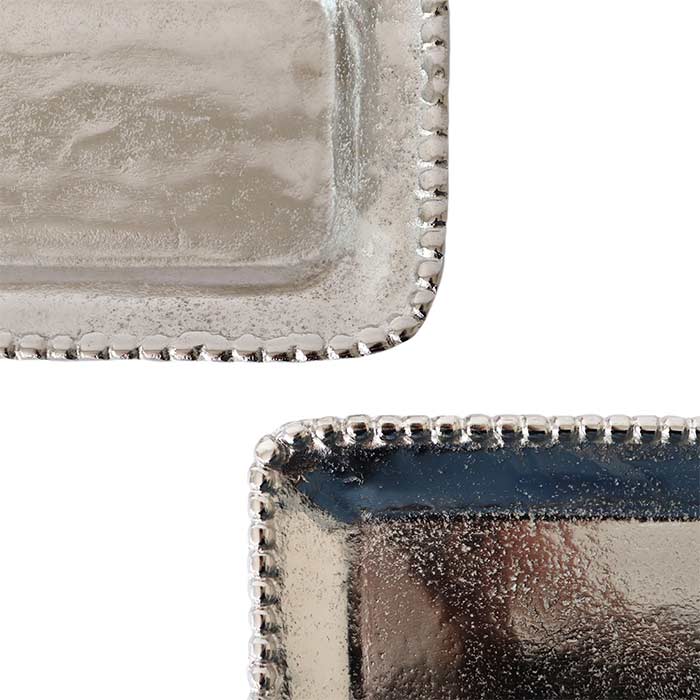 Set due vassoi rettangolari, realizzati in metallo finitura raw silver, con decorazione in rilievo.