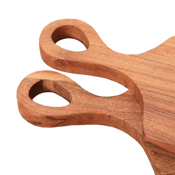 Set due taglieri con manico decorativo, realizzati in legno di acacia, trattati con finitura ad olio.