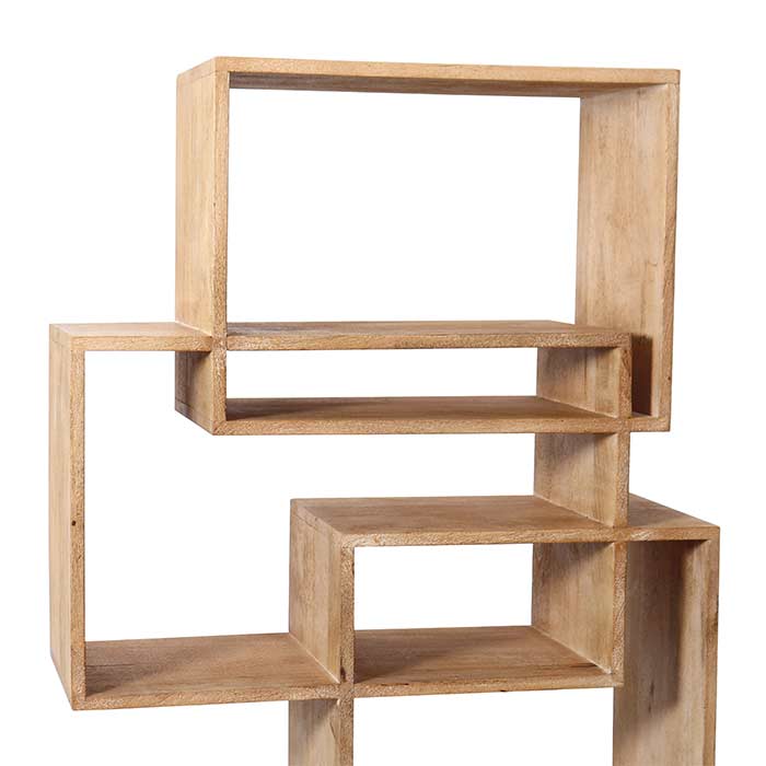 Libreria composta da scomparti di diversa forma e dimensione, realizzata in legno finitura sabbiata bianca e struttura in metallo matt black.