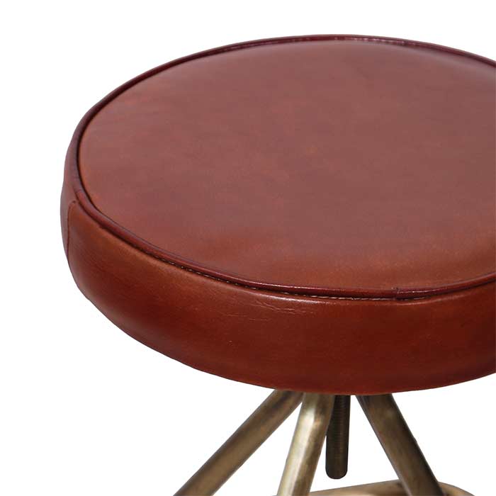 Sgabello con seduta in pelle marrone e struttura in metallo finitura champagne.