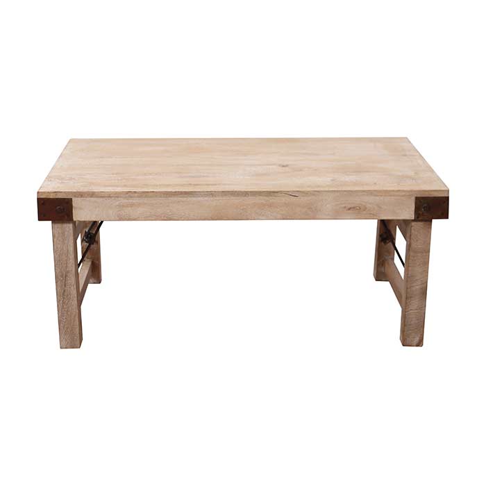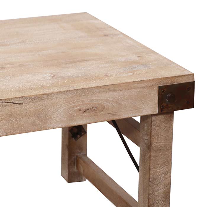 Tavolino in legno di mango, finitura sabbiata bianca, con elementi in metallo finitura anticata.