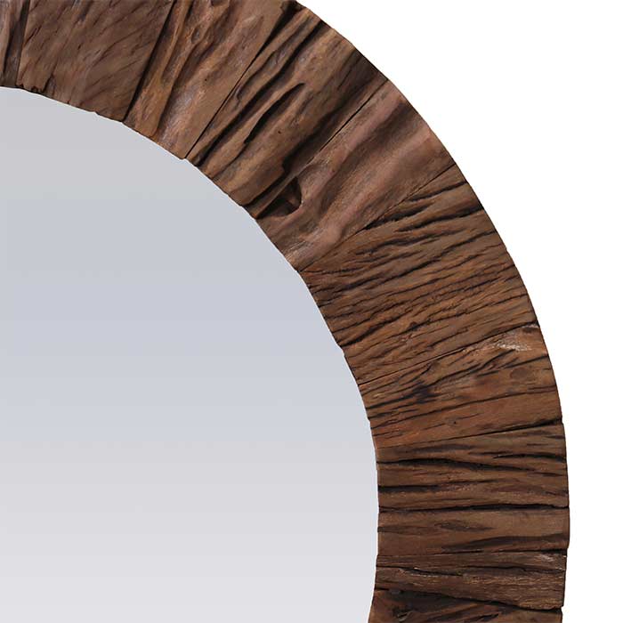 Specchio tondo, realizzato con bordo in legno effetto grezzo.
