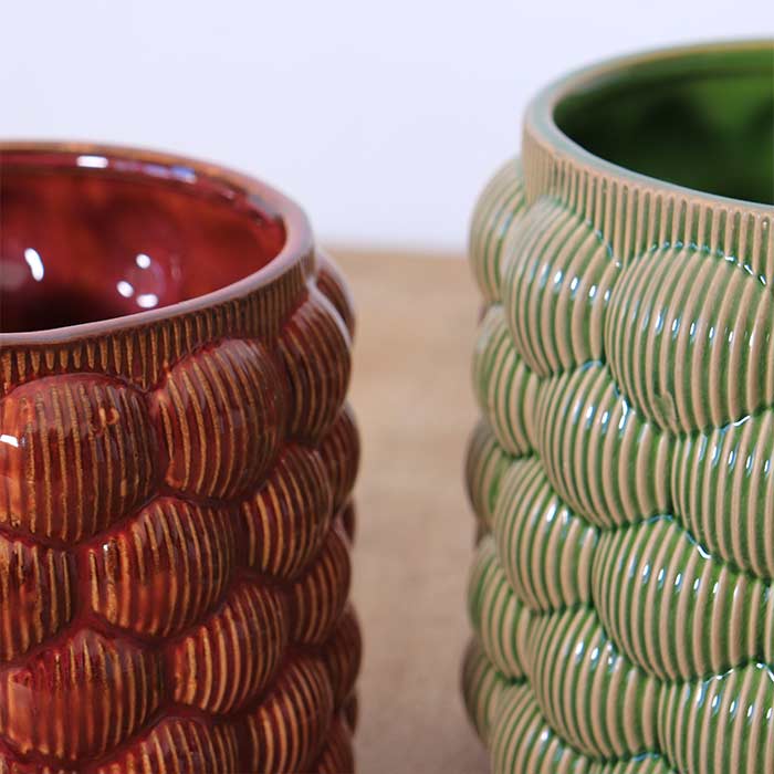 Set due vasi realizzati in ceramica, finitura verde e rossa.
