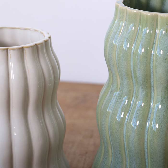 Set due vasi realizzati in ceramica, finitura verde chiaro e bianco.
