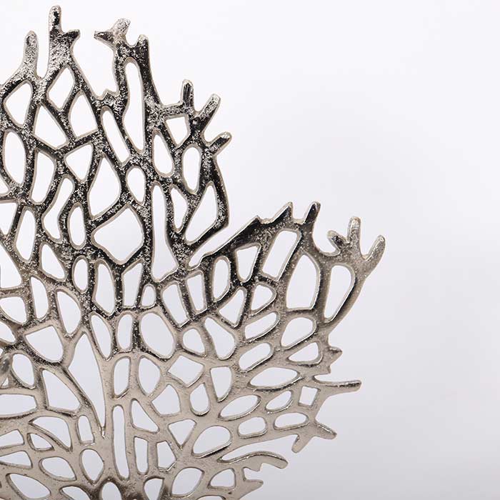 Set due portacandele, realizzato in alluminio finitura argento, a forma di corallo e base in legno finitura naturale.