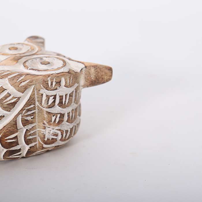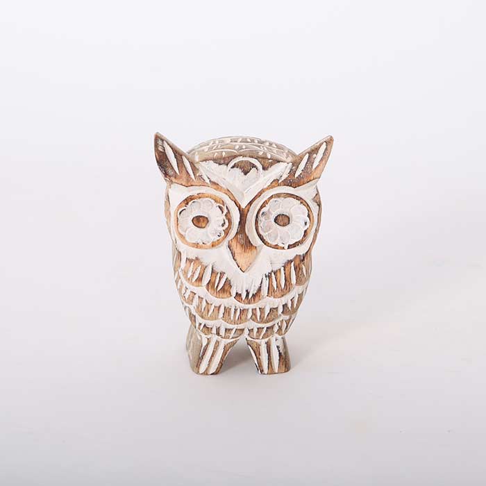 Gufo decorativo realizzato in legno e finitura anticata bianca.