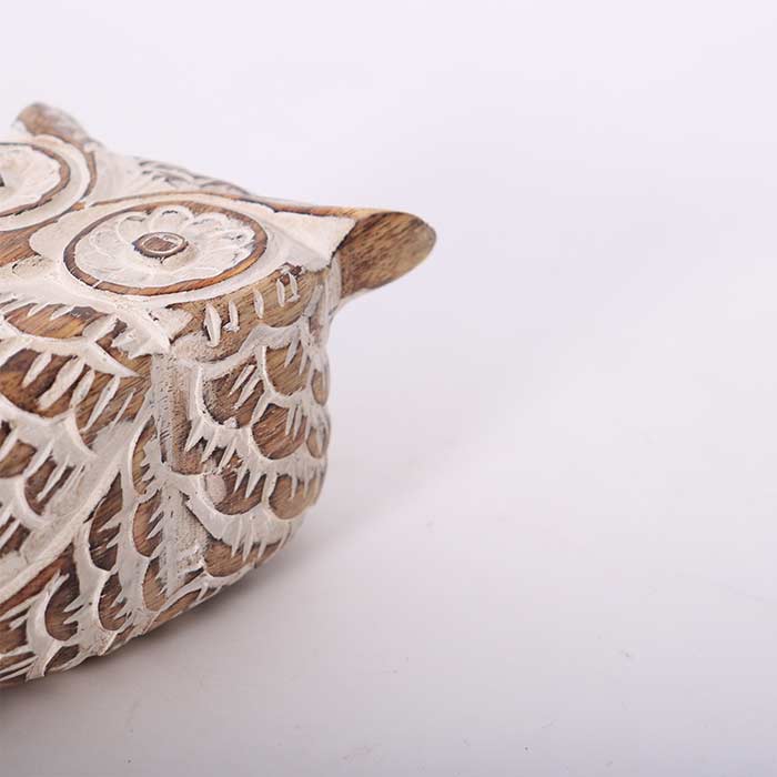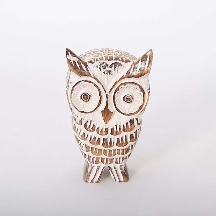 Gufo decorativo realizzato in legno e finitura anticata bianca.
