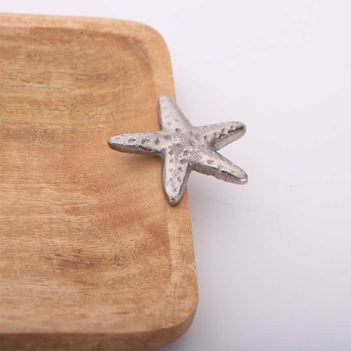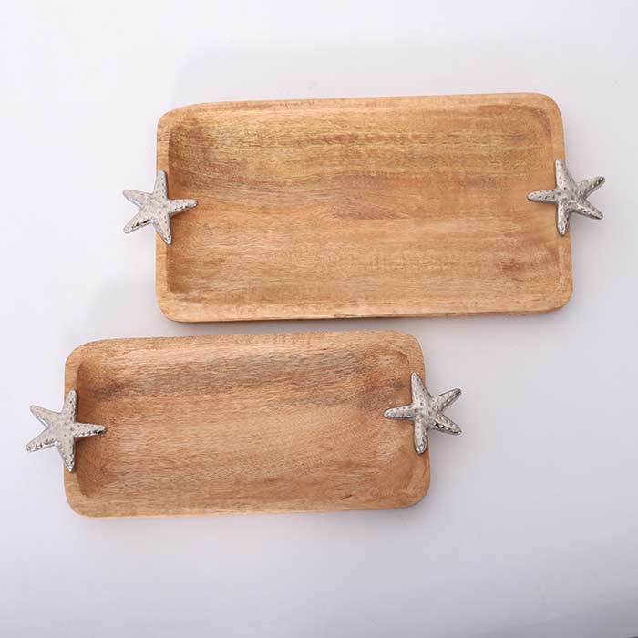 Set due vassoi rettangolari, realizzati in legno di mango, con maniglie in metallo a forma di stella marina, finitura argento.
