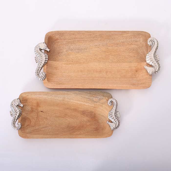 Set due vassoi rettangolari, realizzati in legno di mango, con maniglie in metallo a forma di cavalluccio marino, finitura argento.