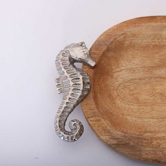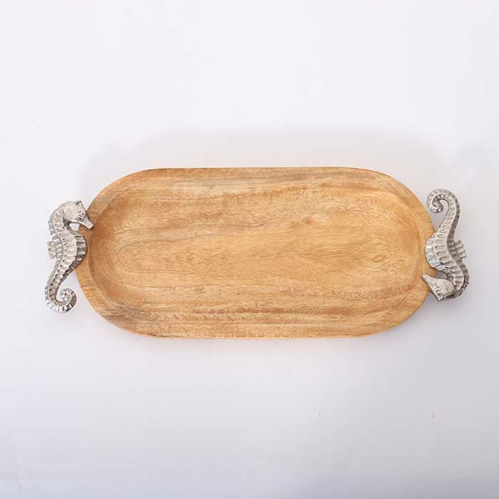 Vassoio ovale, realizzato in legno di mango, con maniglie in metallo a forma di cavalluccio marino, finitura argento.