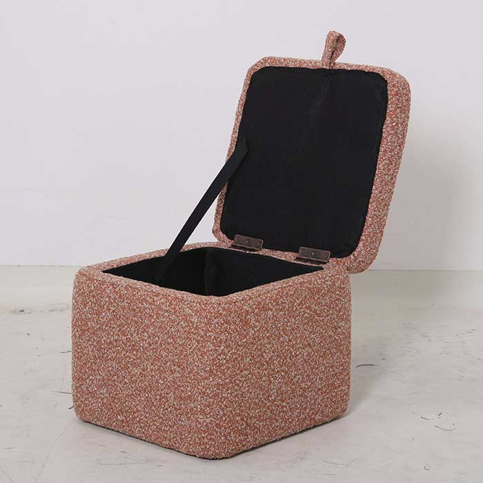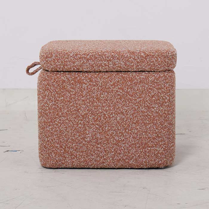 Pouff quadrato contenitore realizzato in tessuto melange color terracotta e bianco.