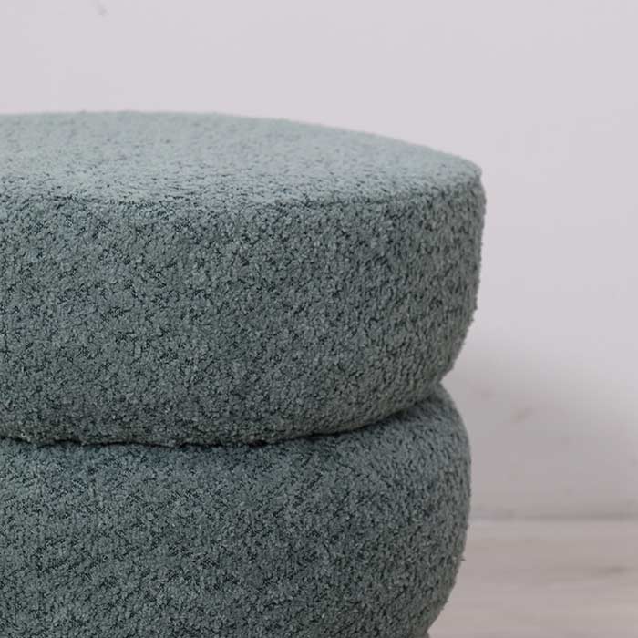 Pouff tondo realizzato in tessuto boucle verde salvia.