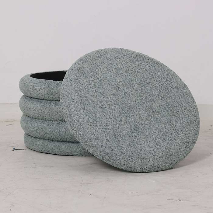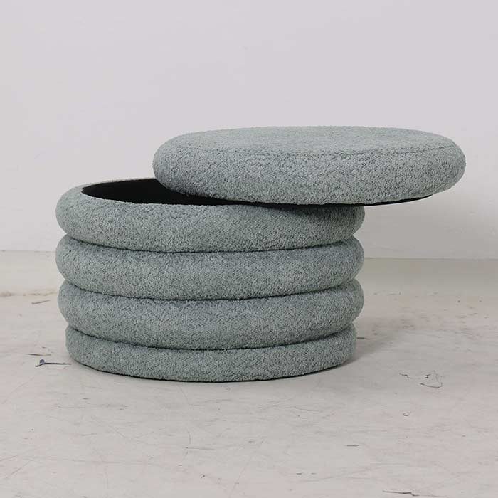 Pouff tondo contenitore realizzato in tessuto boucle color verde salvia.